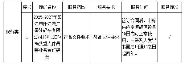 二、采購(gòu)項(xiàng)目名稱:2025-2027年陽(yáng)江市陽(yáng)江港廣泰隆碼頭有限公司13#-1泊位碼頭重大件吊裝業(yè)務(wù)合作經(jīng)營(yíng)項(xiàng)目(二次招標(biāo))