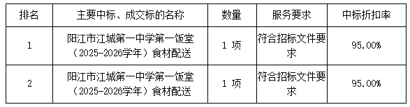 廣東業(yè)信采購招標有限公司受 陽江市江城第一中學 的委托,于2025年8月25日就 陽江市江城第一中學第一飯?zhí)茫?/span>2025-2026學年)食材配送項目(項目編號:YXCG-20250728)采用公開招標方式進行采購?,F(xiàn)就本次采購的中標結果公告如下: