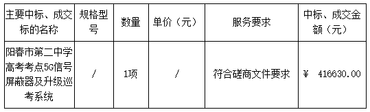 廣東業(yè)信采購招標有限公司受 陽春市第二中學 的委托,于2025年9月8日就 陽春市第二中學高考考點5G信號屏蔽器及升級巡考系統(tǒng)(項目編號:YXCG-20250812)采用競爭性磋商方式進行采購。現(xiàn)就本次采購的成交結果公告如下: